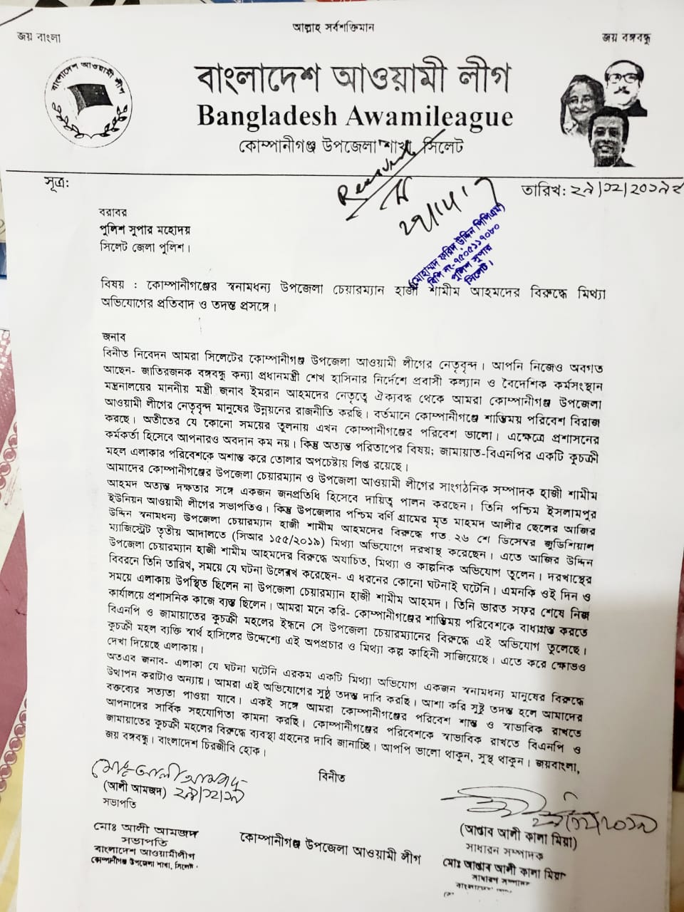 কোম্পানীগঞ্জের উপজেলা চেয়ারম্যান ও উপজেলা আওয়ামী লীগের সাংগঠনিক সম্পাদক হাজী শামীম আহমদের বিরুদ্ধে অপপ্রচার ও মিথ্যা ঘটনায় অভিযোগের প্রেক্ষিতে ক্ষুব্ধ উপজেলা আওয়ামী লীগের নেতৃবৃন্দ। এর সঙ্গে বিএনপি ও জামায়াতের ইন্ধন রয়েছে দাবি করে ঘটনার সুষ্টু তদন্তপূর্বক অপপ্রচার ও অভিযোগকারীদের বিরুদ্ধে ব্যবস্থা গ্রহনের দাবি জানিয়েছেন তারা। গতকাল রোববার সিলেটের পুলিশ সুপার ফরিদ উদ্দিন আহমদ সহ বিভিন্ন দপ্তরে দেওয়া এক স্মারকলিপিতে কোম্পানীগঞ্জ উপজেলা আওয়ামী লীগের সভাপতি আলী আমজদ ও সাধারন সম্পাদক আপ্তাব আলী কালা মিয়া এ দাবি জানান।