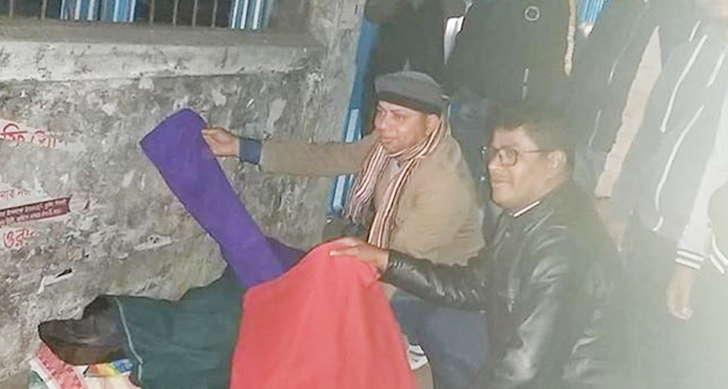 নিজ হাতে কম্বল পড়িয়ে দিচ্ছেন সিনিয়র সহকারী কমিশনার নির্মলেন্দু চক্রবর্তী