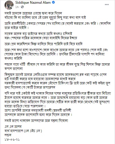 কিছুক্ষণ আগেই আমার এনজিওগ্রাম সম্পন্ন হয়েছে, অনেকগুলো ব্লক ধরা পড়েছে। ওপেন হার্ট সার্জারি করতে হবে। হয়তো বা আজকালের মধ্যেই করবে। সরকারি হাসপাতালেই করবে। কারণ এইদেশে চিকিৎসা ফ্রি তাই আর কেউ কষ্ট কইরা ভুল তথ্য দিয়েন না যে কোটি টাকার অপারেশন। যদি মরে যাই, একটাই কষ্ট থাকবে। নিজের দলের মানুষের প্রতিহিংসার স্বীকার হয়ে মিডিয়া ট্রায়াল হয়েছে বারবার আমার নামে। আর আফসোস হয়তো বা বড় কোনো ভাই আমার নামে অনেক মিথ্যা অভিযোগ দিয়ে আমার নেত্রীর কান ভারি করে রেখেছে। সেই ভুলগুলো হয়তো ভাঙিয়ে যেতে পারলাম না।